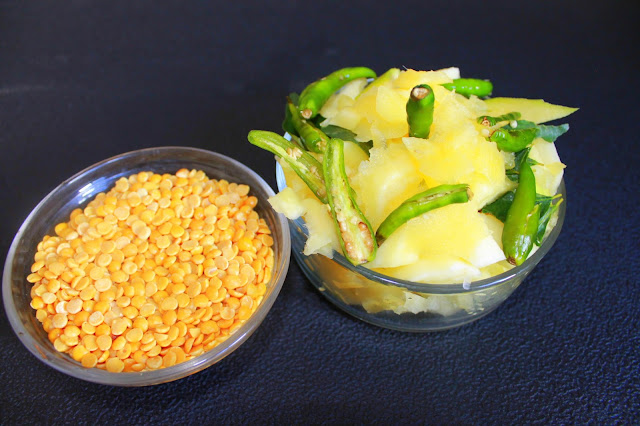 Mango dal or mamadikaya pappu one of our family's favorite dish. I like anything prepared with raw mango. mango dal ,mango tokku ,mango rice or mango rasam.... ok list goes on..oh i miss those different varieties of mangos here... .I remember when we are in BHEL ,our neighbors had a big mango tree right next to our compound wall. With so many mangoes available ,mango used to be in every dish in this season.